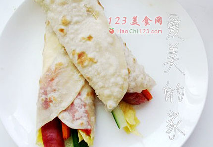 8、将一片摊好的面饼平铺于盘中,依次放入烤好的香肠,芝士片,黄瓜条,胡萝卜条,鸡蛋条,按自已的喜好挤入蕃茄酱或是色拉酱即可。