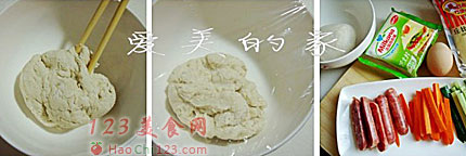 2、面团醒发的时间准备好所有材料,将黄瓜,胡萝卜切成细条,香肠对切成二片。