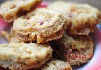 12、放入五六成热的油锅中,用中火慢慢炸至外表金黄即可,最后可以搭配椒盐食用。