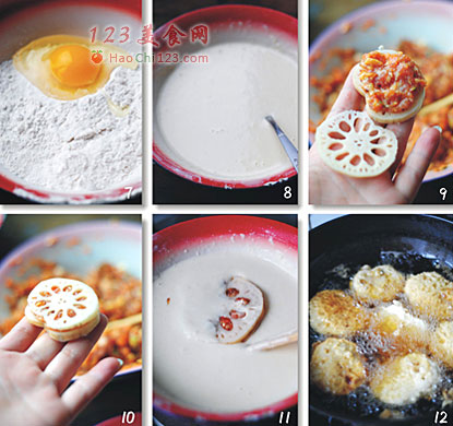 2、肉馅一定要搅拌上劲,否则肉末无法粘在藕片上,下锅一炸就自然脱落了。