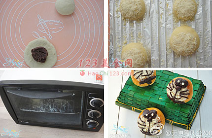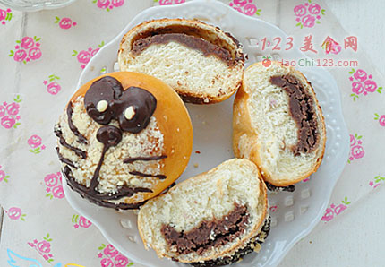 14、烤好后取出晾凉,巧克力隔水融化,在面包上挤上表情,放冰箱冷藏片刻至巧克力变硬即可。
