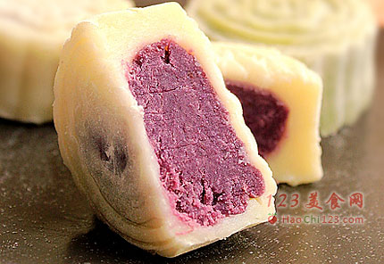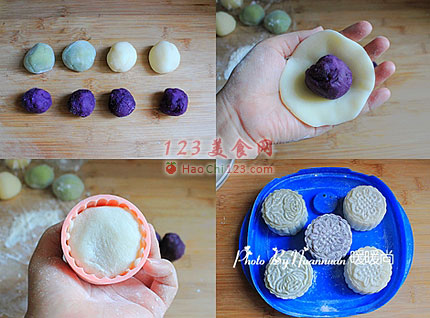 1、我的模具是63g/个,将冰皮粘上糕粉按36g一个团成球,紫薯泥27g一个团成球。