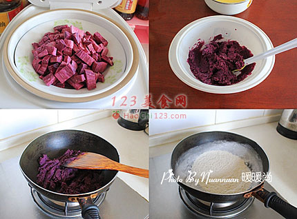 2、蒸好的紫薯用勺子捣成泥,想口感更细腻可以过一遍筛。