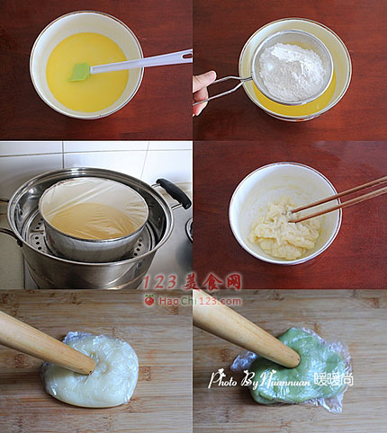 5、将拌匀的面糊均分为两部分分装入保鲜袋内,一部分什么都不加用擀面杖细细的捣匀为原味饼皮。