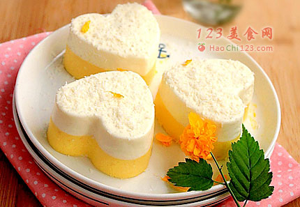 2、脱模后在芒果酸奶冻芝士蛋糕表面撒上一些椰蓉点缀,放入冰箱冷藏或室温环境下放置半小时即可食用。