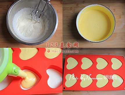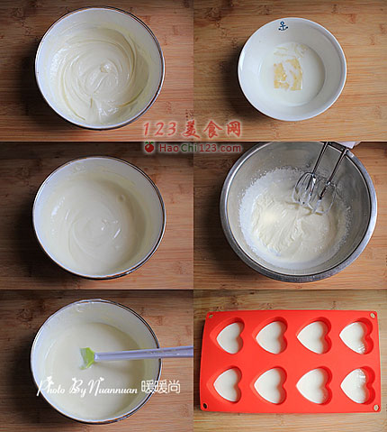 6、将酸奶糊用裱花笔分装到心形模具中,放入冰箱冷冻。
