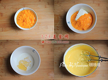 6、将打发的淡奶油同步骤4的混合无拌匀即成芒果糊。