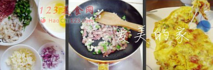 2、将平底锅加入色拉油置于中火上,加入培根,青椒,平菇,洋葱炒香。
