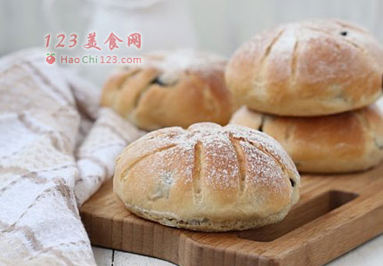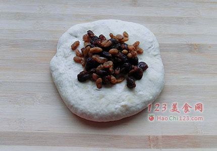 5、面团取出排气,包入沥干水份的泡酒果干,揉匀。