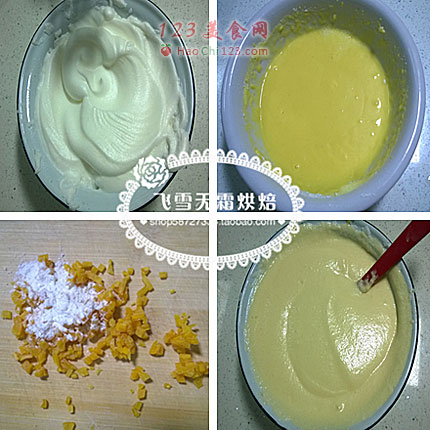 4、然后分二次将蛋白霜加入到蛋黄糊中混合。