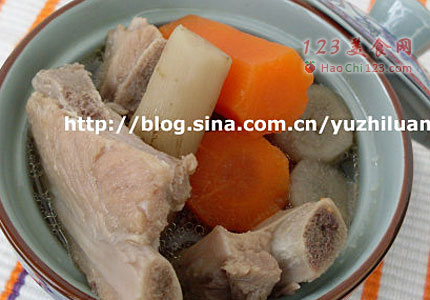 5、撇净浮沫以后,加入切好牛蒡和胡萝卜段和适量盐,然后转入高压锅中。