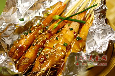 7、将虾串放入锡箔纸,均匀的浇入腌汁,包紧,上面覆盖事先烤热的盐保温,即可上桌食用。