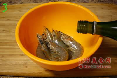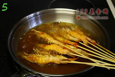 2、炸虾的油不用太多,用过之后最好弃掉,如果用竹签串起油少不好炸,可以弃用竹签,或者用铁勺舀起热油淋在炸不到的虾上。