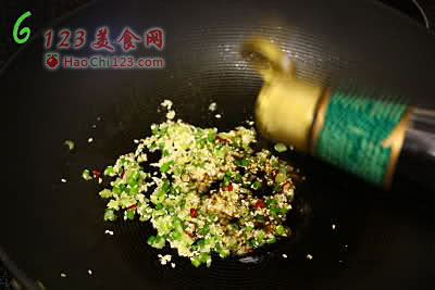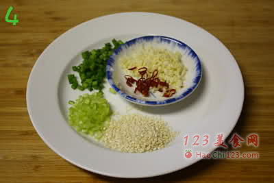 6、另取锅烧热,放入少量的油,倒入所有4料和白芝麻小火炒香,加入适量蒸鱼豉油拌匀成为腌汁。