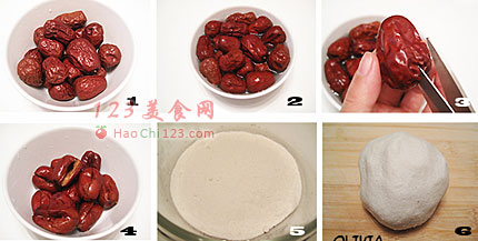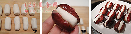 8、取去核的红枣,将面剂子塞入红枣中,用手指将大枣和面团轻轻捏和。