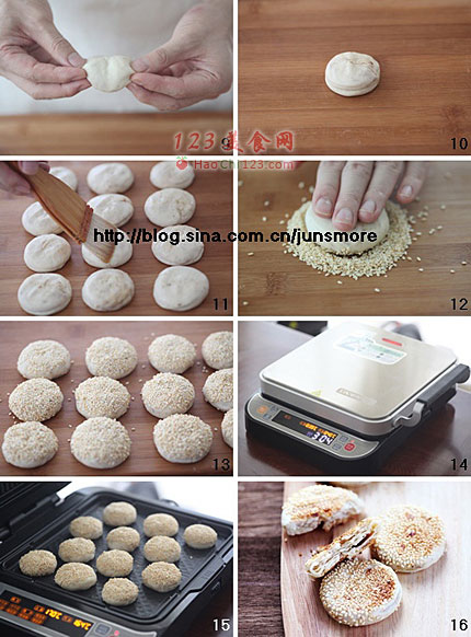 12、将白芝麻铺在案板上,拿起圆饼,用刷了蜂蜜水的一面压在芝麻上,使它沾满芝麻。