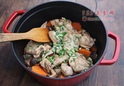 4、加入一小碗水后盖上锅盖,电磁炉开900焖20分钟。汤汁可以根据喜好添加。用明火的,保持外圈刚好有火就行了。中途不要揭盖,出锅前加一档焖一分钟稍微收汁儿。然后撒上葱花,拌匀就可以吃了。