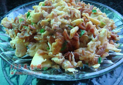 4、鸡蛋吸足油脂变态完毕,这时把切碎的萝卜干和丁香鱼倒入锅中(用铲子搅拌几下)。这时重要的是抓紧时间用铲子尽可能地把鸡蛋捣成小块,捣几下,再搅拌几下,如此反复几轮,直到鸡蛋萝卜干丁香鱼均匀混合在一起,加入鸡精、葱花、少许盐(也可不加,因萝卜干丁香鱼均有咸味了)即可。
