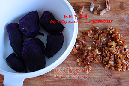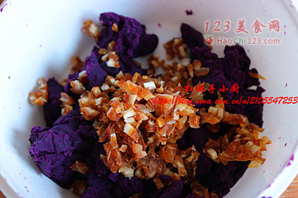 4、将椰枣粒倒入紫薯泥,拌匀。