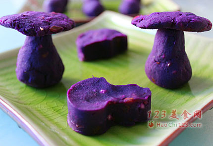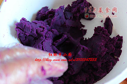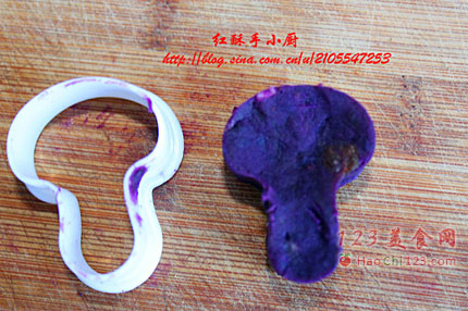 5、挖一块紫薯泥,在手里团圆了,放在做饼干的小模具里,稍稍一按,就成了。