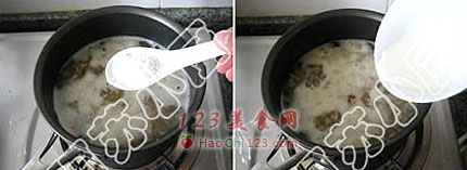 4、加入3大勺甜酒酿,用勺子轻轻波动,使圆子米粒不粘在一起。