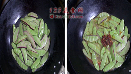 3、看到扁豆有点变颜色后,放入水和牛肉酱,炒几下,盖上锅盖。