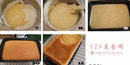11、烤制出来的蛋糕倒扣放凉,用心型慕司圈在蛋糕上扣出图案备用。