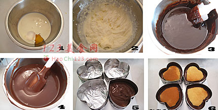 5、取四个心型慕司圈,用锡纸包裹住底部,将巧克力慕司馅均匀的倒入慕司圈中,1/3满即可。
