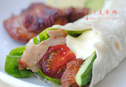10、用煎好的饼将生菜、小番茄、黄瓜条、生菜、奶酪片卷起来即可。