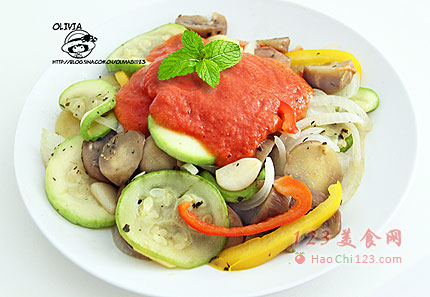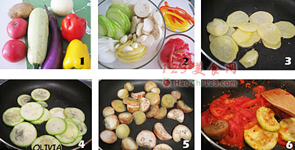 9、已经制作成七成熟的西葫芦、土豆片、茄子内放入彩椒丝、洋葱丝,加入蒜片、少许食盐、罗勒翻炒均匀。