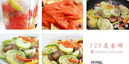 11、把糊状的西红柿酱料撒入蔬菜烩中即可。