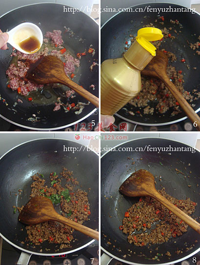 5、放入牛肉糜,淋入烤肉酱,炒至水份微干。