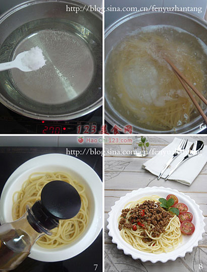 贴士:象面条、意粉这一类的食物,煮熟了如果处理不当会粘到一块,掌握以下三个小招,就可以不粘连: