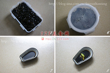 7、8、将日本酱油和芥末放入味碗中,木耳丝即可醮芥末酱油食用。