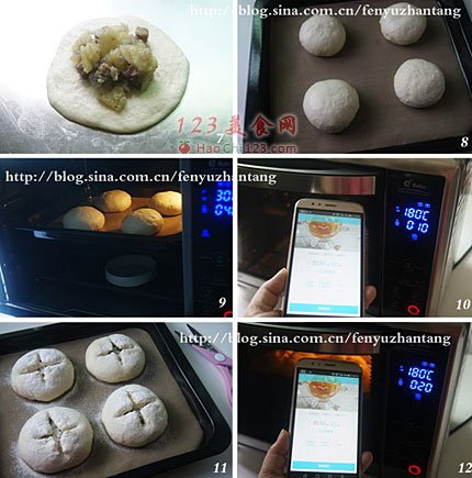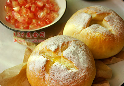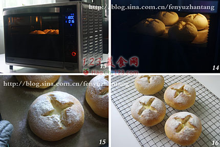 11、将面团表面筛上一层高粉,用剪刀剪一个十字口。要看到内馅才可以,不要剪的太小,不然一进烤箱,面团膨胀的时候,口就被挤上了。