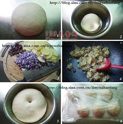 3、这时我们先做内馅,洋葱、火腿切丁,土豆去皮切成片。