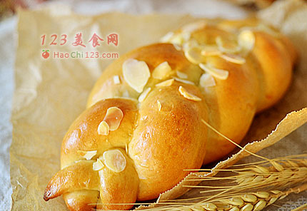 9、发酵完成后,在面团表面刷一层稀蛋液,撒少许杏仁片。