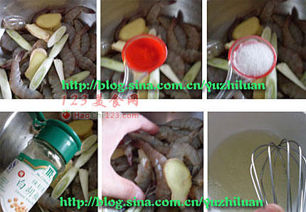 7、虾腌好以后捡去葱段姜片不要,均匀的撒上少许干面粉拌匀。