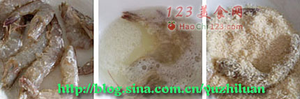8、将虾放入蛋清中沾匀蛋清,然后放入面包渣内滚一下,均匀的粘上面包渣。