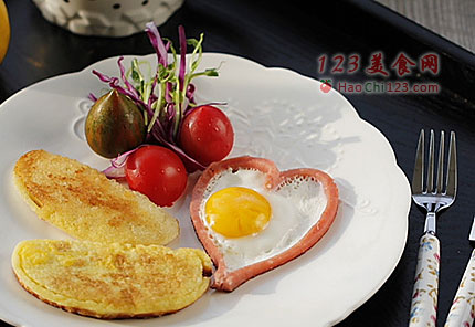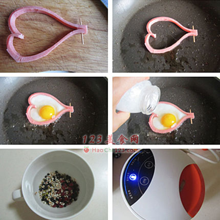 3、煎鸡蛋时直接将鸡蛋打入火腿爱心圈中,按自己口味单面煎或者双面煎。