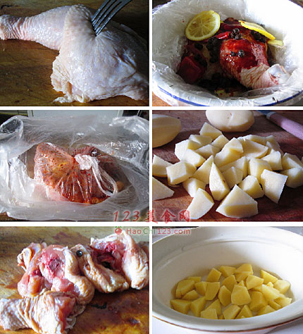 2、取一大碗,在碗上套个食品袋,加入鸡腿和所有辅料。