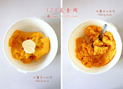 3、等待的过程中制作红薯馅,红薯去皮,用勺子碾成泥,加入室温软化的黄油。