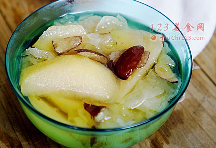 2、雪梨去皮切成大小一样的块状、.红枣去核剪成条状、银耳泡发。