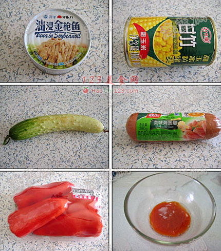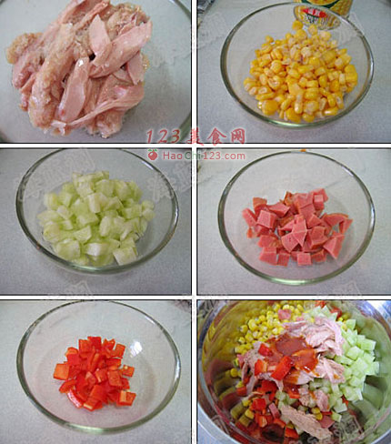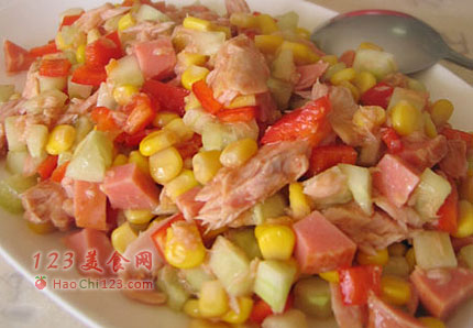 4、将金枪鱼、黄瓜丁、红椒丁、火腿丁、甜玉米粒放入一个大的容器里,浇上刚做好的沙拉酱汁,搅拌均匀即食。
