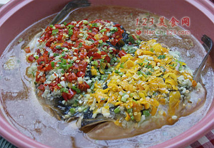8、将姜粒、蒜粒、黄金剁椒和红剁椒依次抹在鱼头。