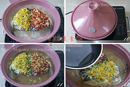 4、传统的“剁椒鱼头”一般是用清蒸的方法,可这次我却把“剁椒鱼头”用火锅来演绎。一般清蒸“剁椒鱼头”采用一腌二蒸三淋油三步骤,而“剁椒鱼头”火锅却比清蒸的多了一个步骤和改了一个步骤,采用了一腌二炒三煮四淋油四个步骤,做出来的“剁椒鱼头”比清蒸更嫩滑。