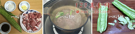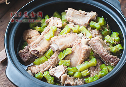 1、苦瓜炆排骨可以用陶瓷煲或者紫砂煲中来做,加入的清水一碗足够,刚刚没过排骨啊为宜。在烧制过程中一直用的是小火,温温的小火能保证排骨肉质的柔嫩,让苦瓜汁慢慢的渗透到排骨中去。