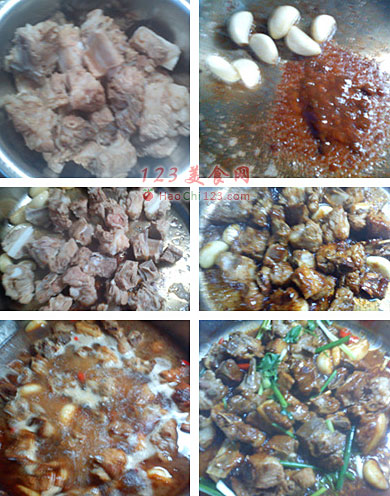 2、热锅下油,下蒜头煸香,加入一大勺黄豆酱,再加入飞好水的排骨煸炒。