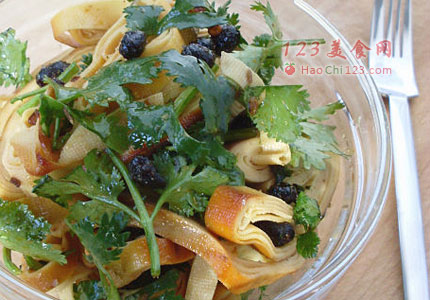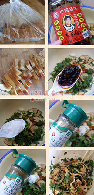 3、将豆片和香菜段放到盆中,加白糖,孜然粉,少许胡椒粉,一勺老干妈风味豆豉,少许盐(盐一定要少加),味精和香油,拌匀即可。