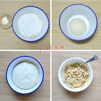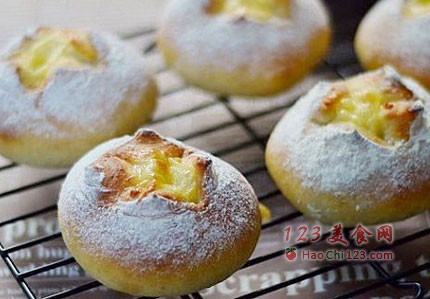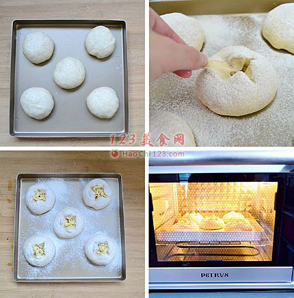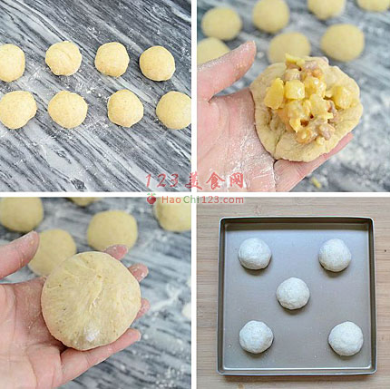 4、松驰好的面团再次用手轻压排气,包入足够的馅料,哈哈,包多多,馅料多多的面包最好吃,排放在不粘烤盘里。